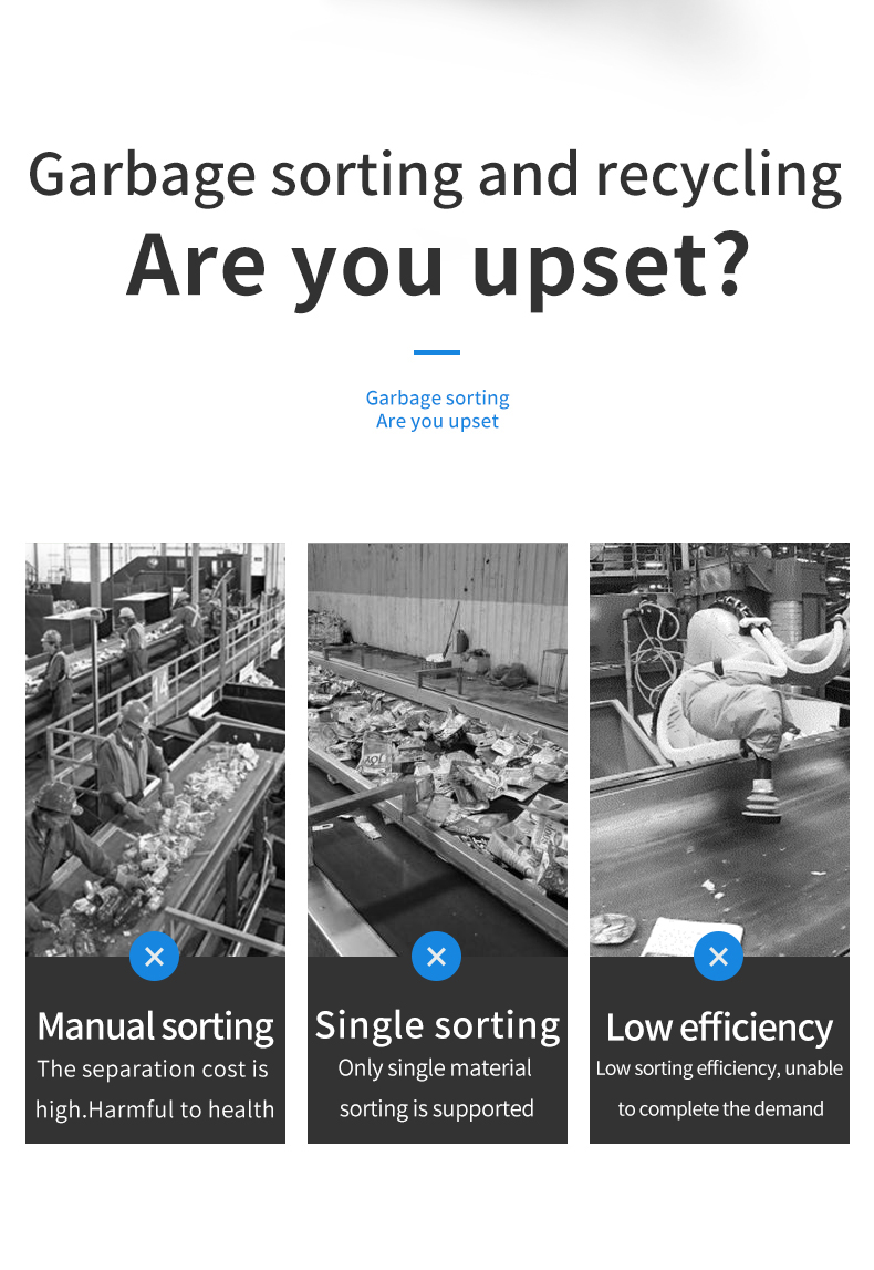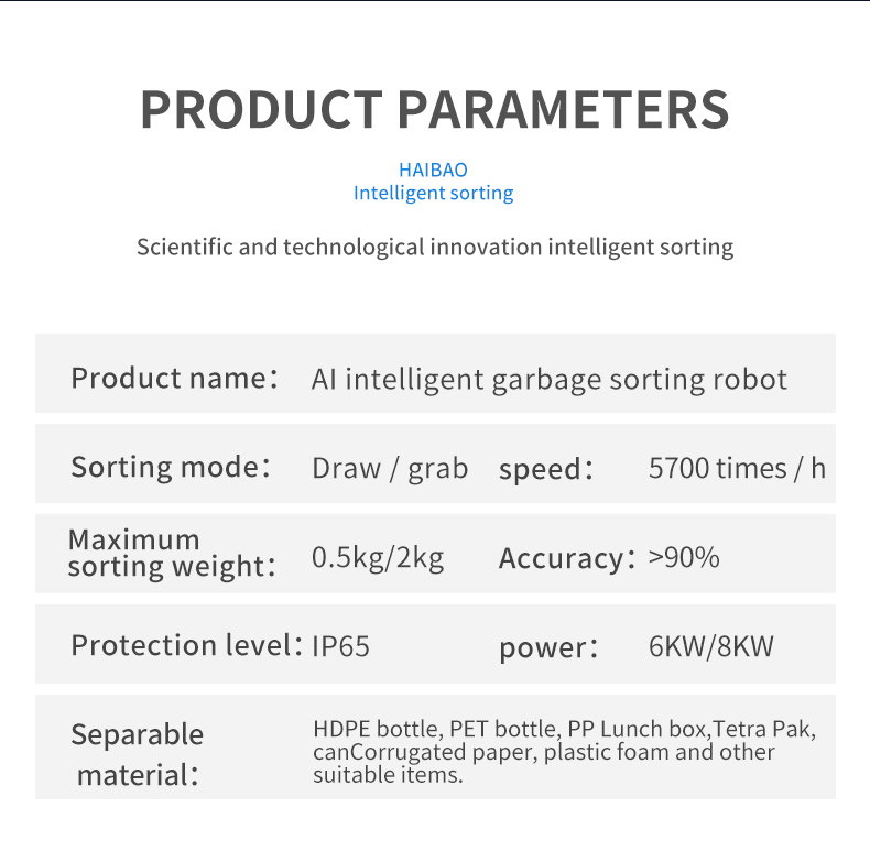 The sorting speed of this equipment is fast and the effect is good. It can complete 1.5 garbage sorting actions in one second, with sorting times up to 95 times per minute, and the sorting accuracy is more than 90%, so as to truly realize that robots can replace manual operations and upgrade the traditional garbage sorting mode to intelligent garbage treatment mode.