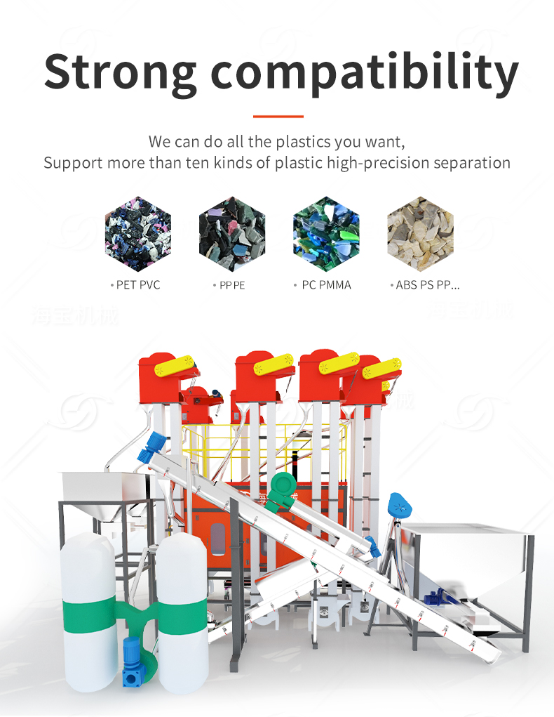 1) मिश्रित प्लास्टिकवर लागू केले जाते जे फ्लोटेशन प्रक्रियेच्या घनतेने वेगळे केले जाऊ शकत नाही